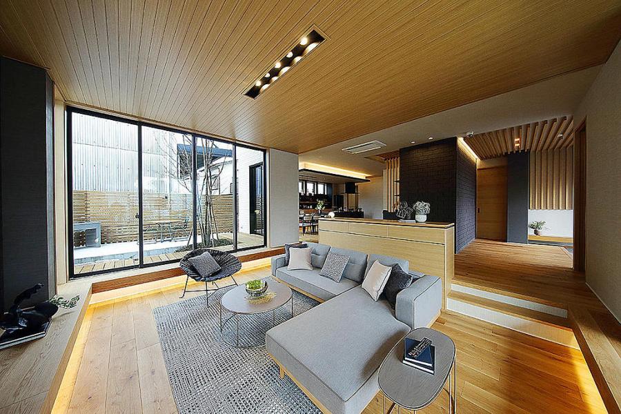 緑の風が感じられる、素材感を生かした知的なリビング。壁面の大開口グランフルサッシは、堂々の天井高。さらに床を少し下げることで、くつろぎ空間が実現しました。両翼には広いウッドデッキと庭がせり出し、高知の青空へとつながります。表側は家の格調を感じる「静の庭」、裏手はバーベキューなどアクティビティに使える「動の庭」をイメージ。精緻にデザインされた間接照明も家全体の見どころです。