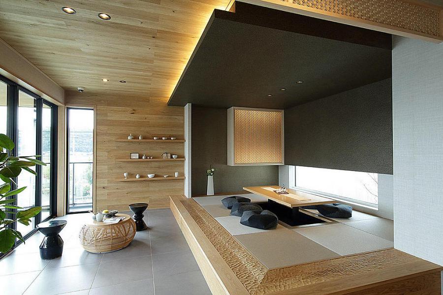 ■土佐の組子細工が華やかにむかえてくれる和の空間が2階に。土間の趣味室からは深い軒の外に広がる景色を堪能できます。
