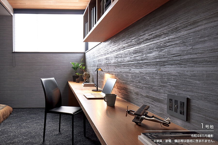 TVボードやテレワークスペースとして利用できる長さのあるカウンターの採用や床にはカーペットを採用し、多様な使い方のできる落ち着ける空間