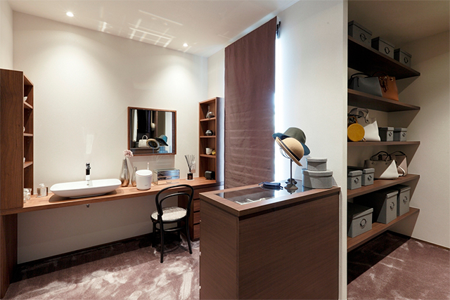 主寝室の奥に設けた奥様専用のパウダールームは、お出かけ前の準備などONモードへ切り替える場として、おやすみ前のスキンケアなどOFFモードの癒しの場として、多彩に。
