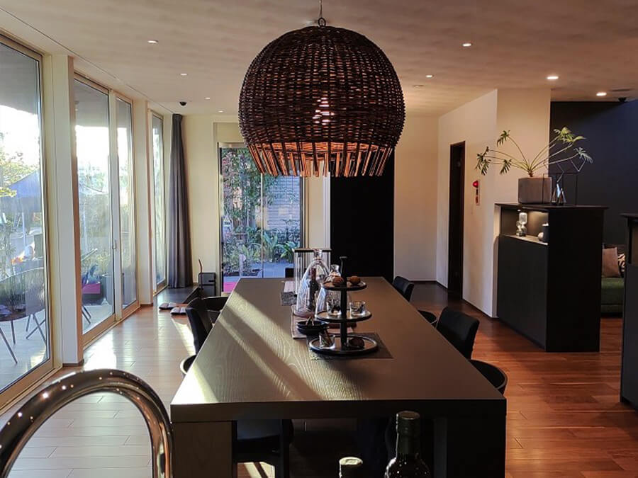 アイランドキッチンからは、大きなダイニングテーブルと大開口のテラスが見えます。そして、来客も。お友達を呼んで、一緒にお料理がしたいと考えた奥様のベストポジションです。