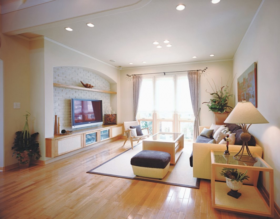 大きな3連窓と中央の吹き抜けが開放的なリビングルーム。壁にはレンガタイルを貼り、床には無垢材のフローリングを採用。自然素材が放つ心地よい空気感が豊かなコミュニケーションを育みます。