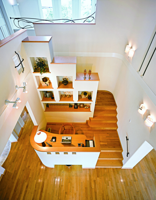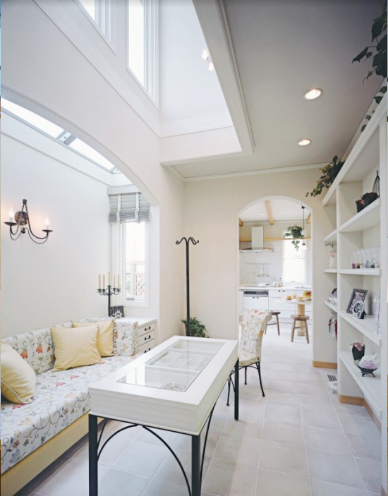 吹き抜けがもたらす開放感と天窓から射し込む陽光がくつろぎのひと時を彩ります。奥様の趣味の手芸や、友人とのティータイムを楽しむ、心安らぐ場所です。
