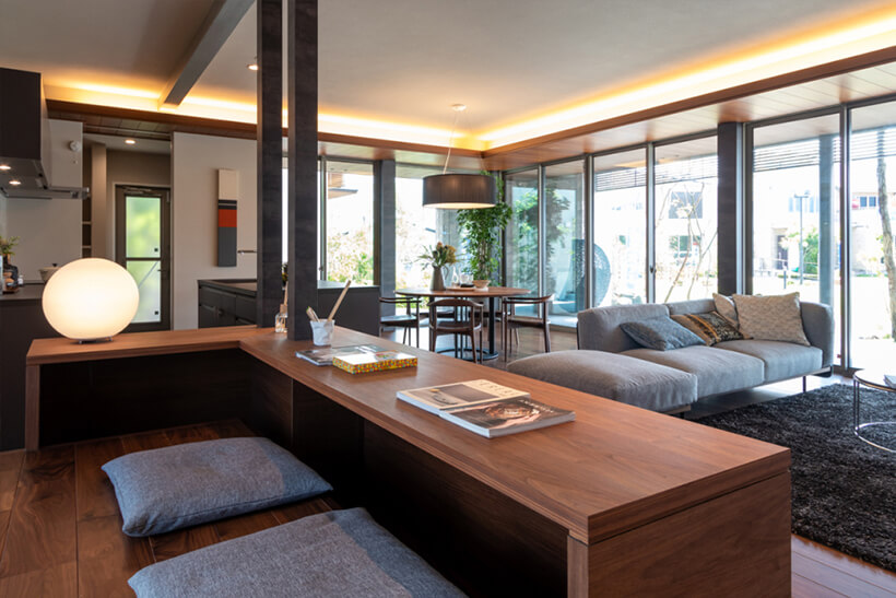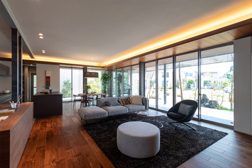 内と外をゆるやかにつなぐスローリビング 4mの大開口サッシが連続し、積水ハウスの構造強度で実現する柱のない大空間リビング。