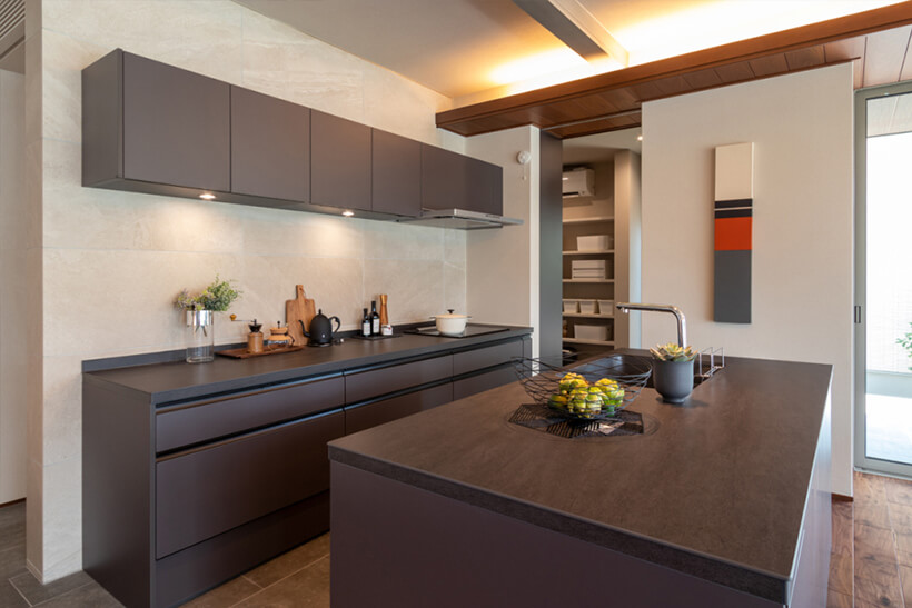 家族の団らんを生むオープンキッチン カウンターも水栓もカップボードも、デザインと機能にとことんこだわった「見せるキッチン」。ご友人を呼んでのパーティーにも最適です。